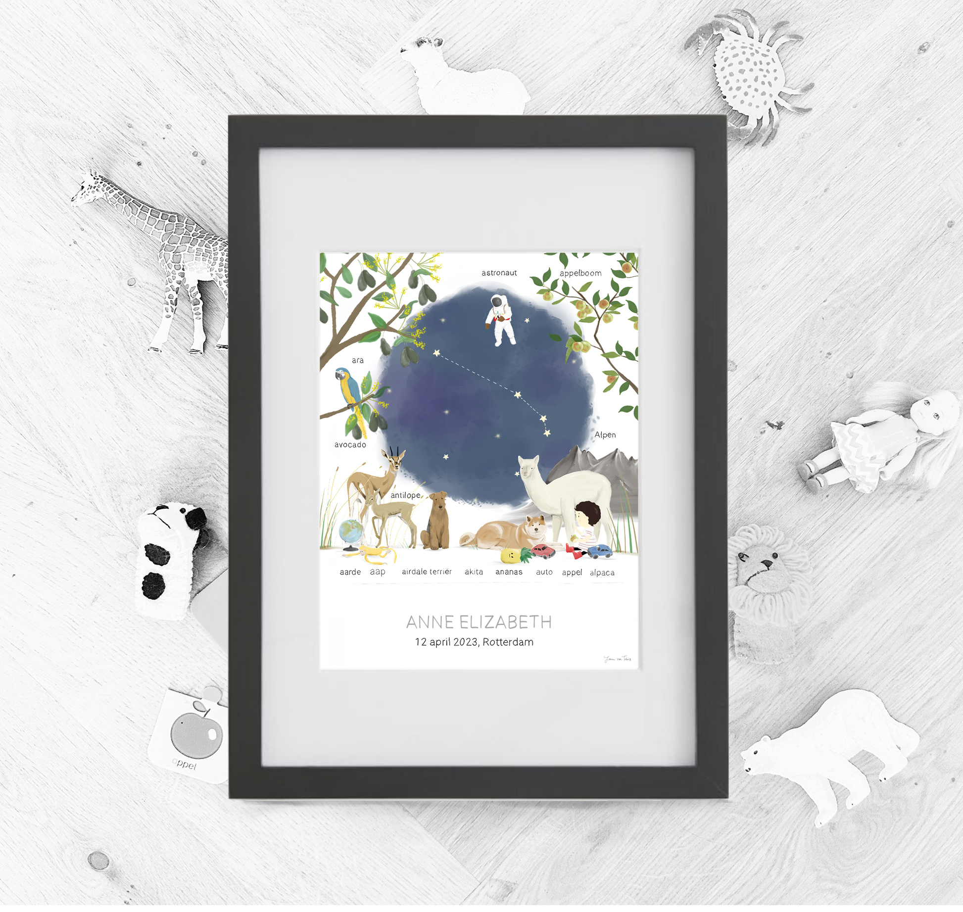Jouw geboorteprint wordt dan gemaakt met de letter van het alfabet waarmee de naam van het kindje mee begint. We lijsten hem voor je in of we versturen de poster in een steviger kartonnen doos als je hem zonder lijst wil. De lijst komt inclusief met een passe-partout. Geef jij deze geboorteposter kado? Dan kun je dit aangeven in het tekstvak waar je ook je personalisatie opgeeft. Wij zullen je bestelling dan inpakken voor je!
