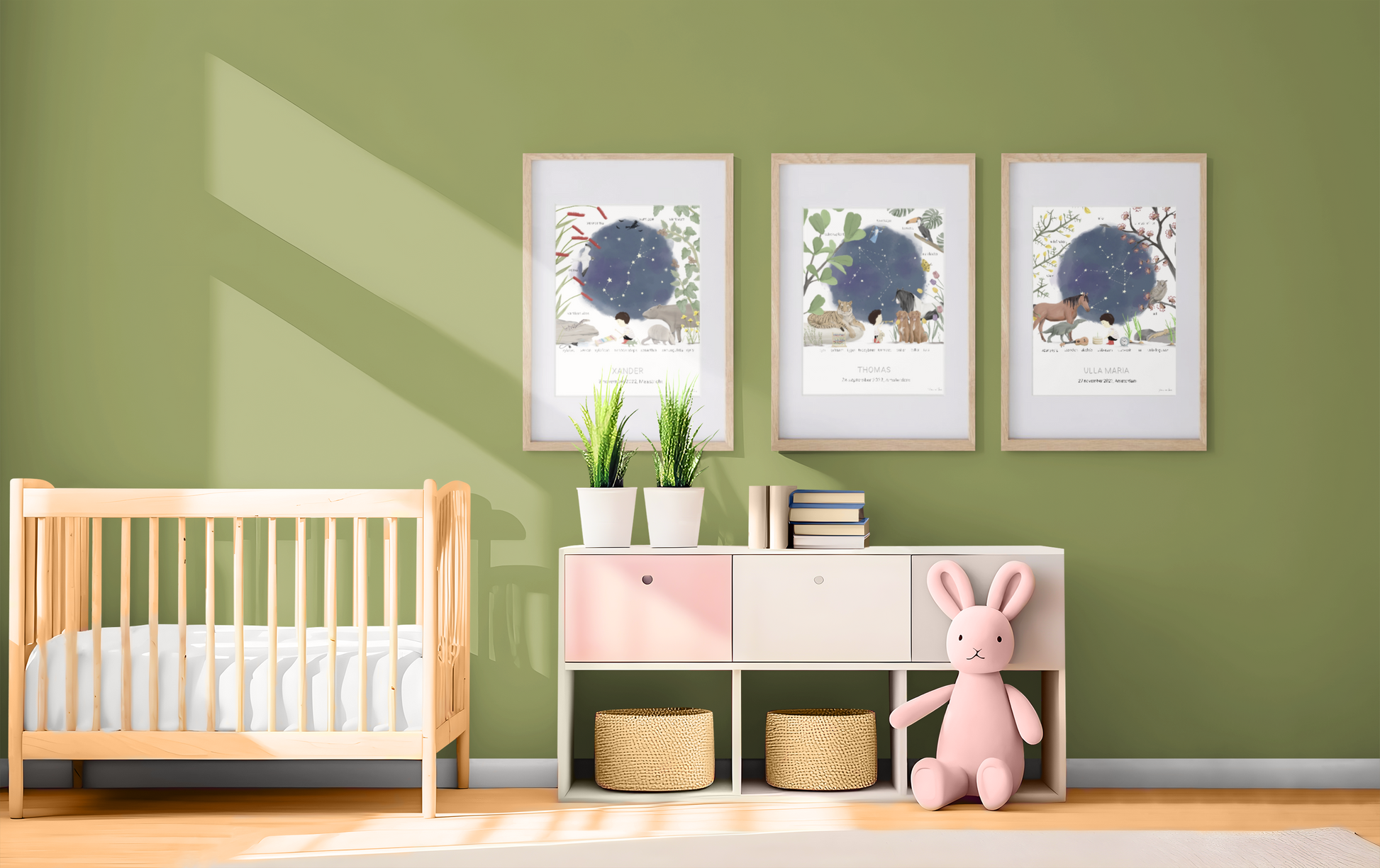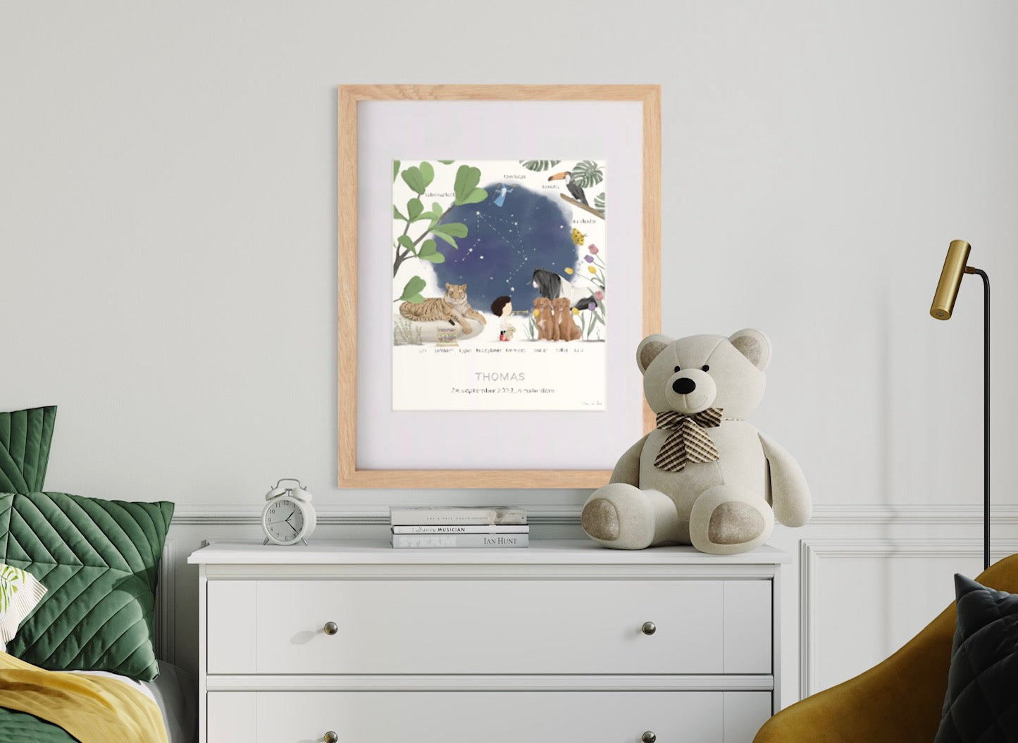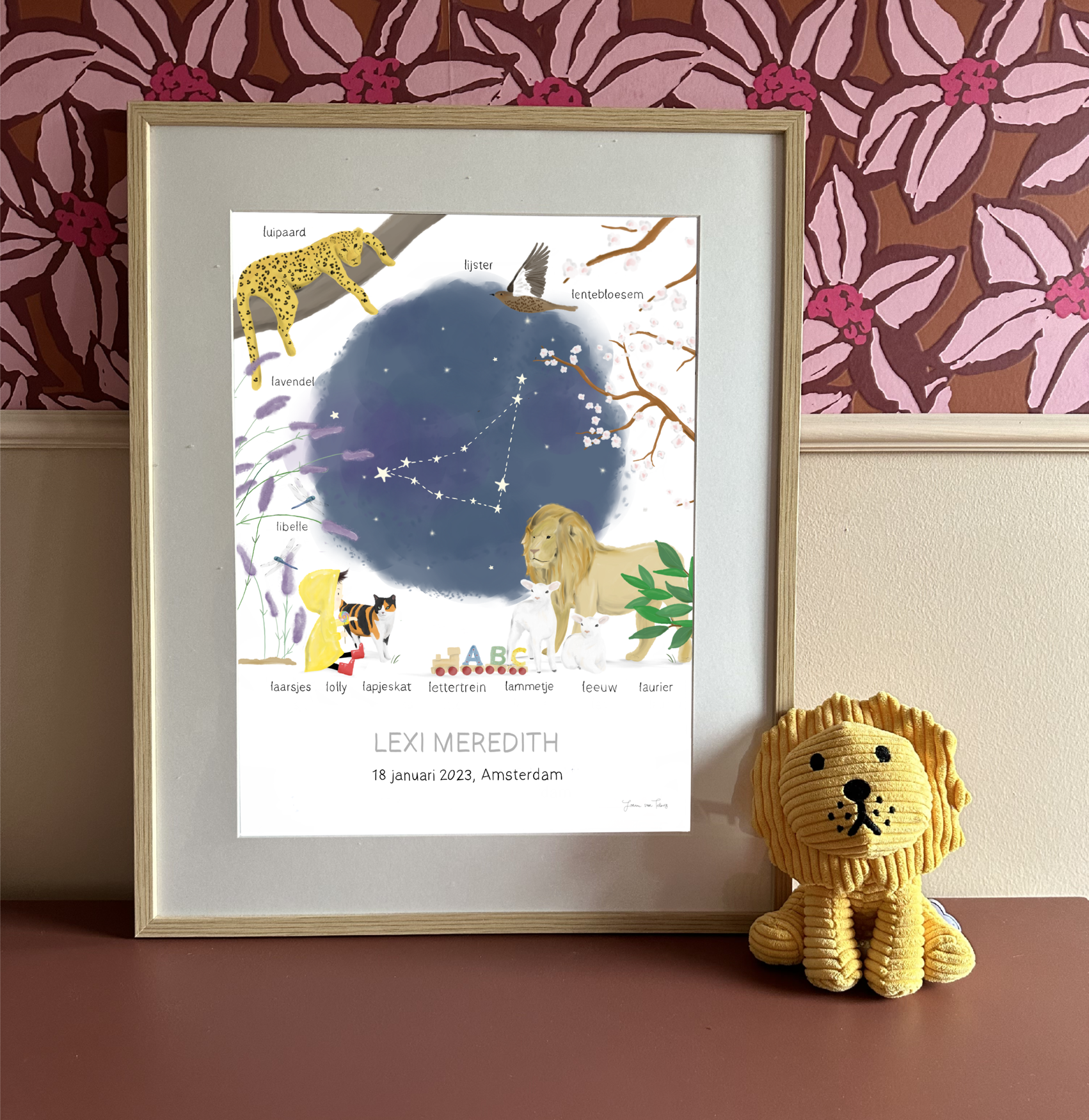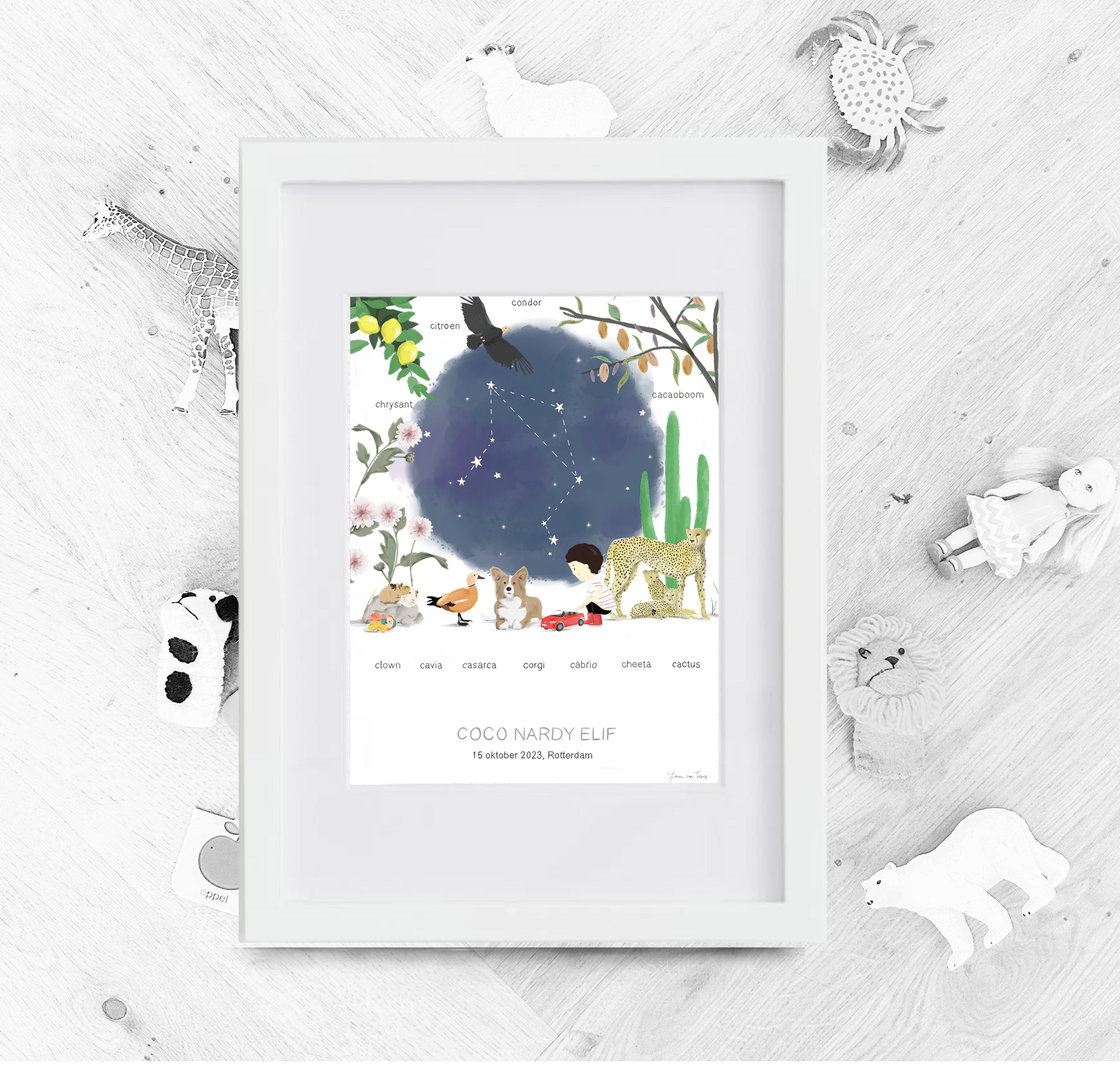 Uiteraard personaliseren we de geboorteprint met de naam of namen van jouw kindje, het sterrenbeeld dat past bij de geboortedatum en de geboorteplaats. Zo creëren we een unieke geboorteposter voor dit bijzondere moment.