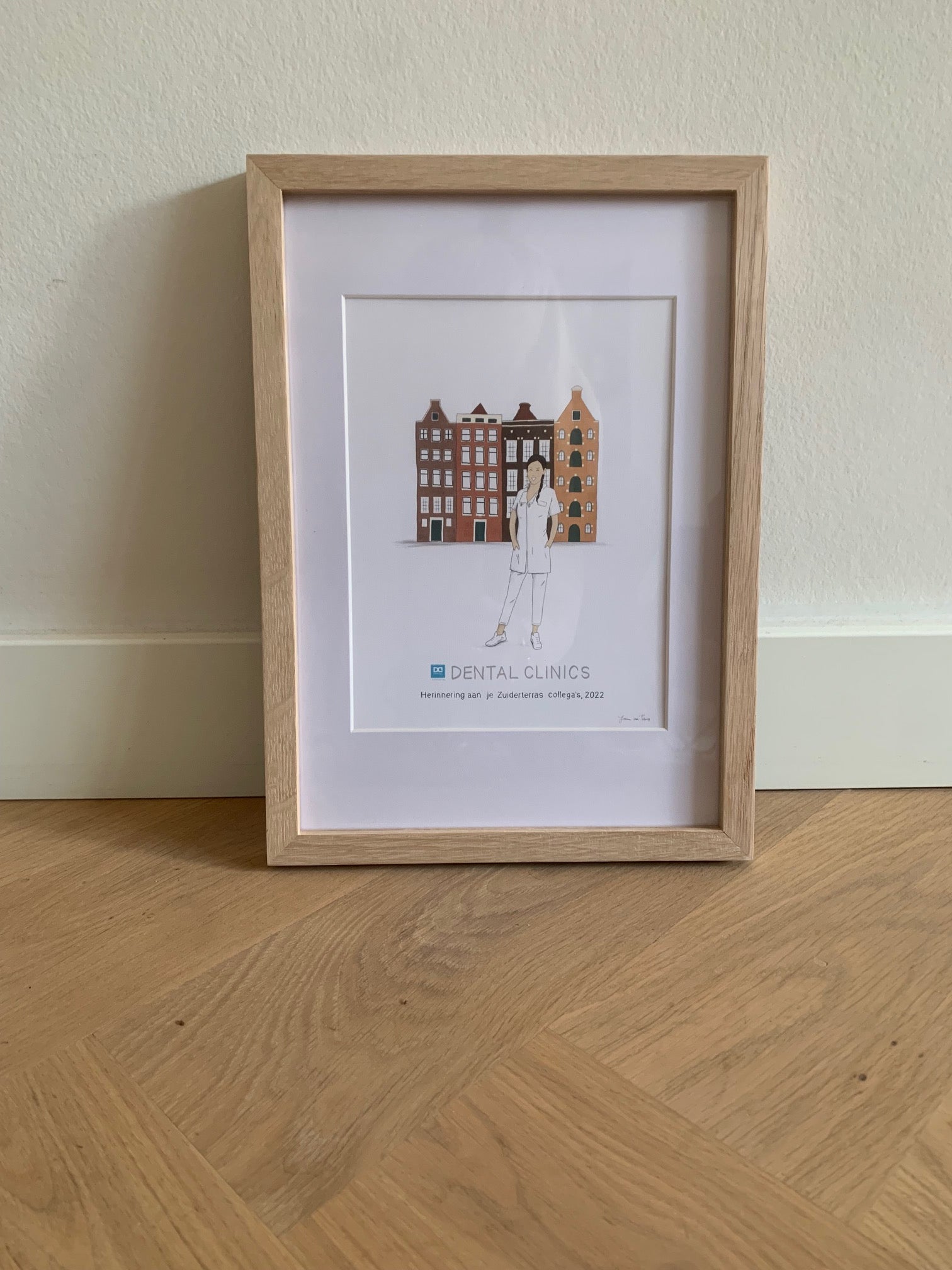 De prijs voor een gepersonaliseerde illustratie (inclusief ontwerp, lijst en passe-partout) varieert tussen €200 en €300, afhankelijk van formaat en complexiteit.