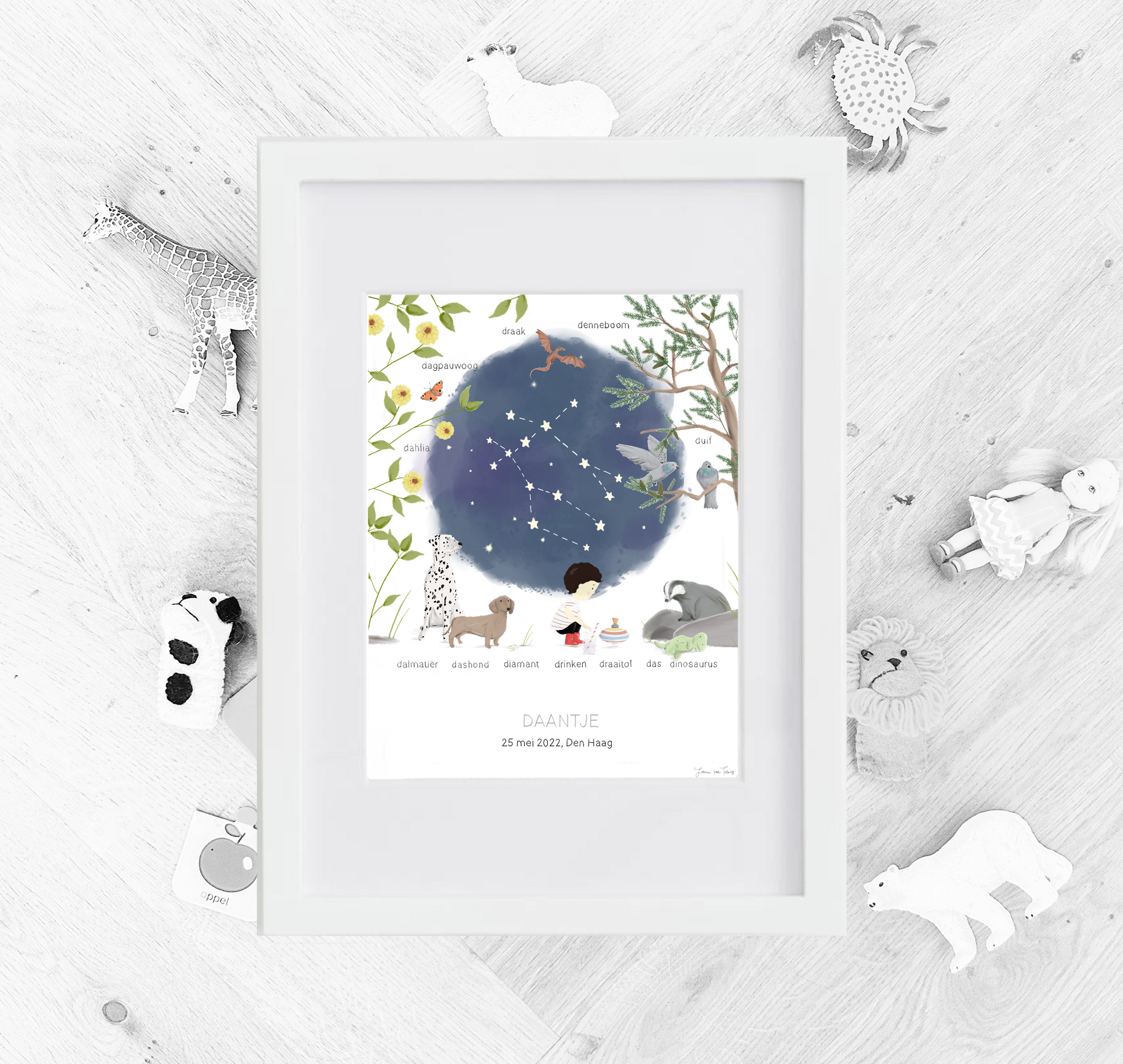 Uiteraard personaliseren we de geboorteprint met de naam of namen van jouw kindje, het sterrenbeeld dat past bij de geboortedatum en de geboorteplaats. Zo creëren we een unieke geboorteposter voor dit bijzondere moment.