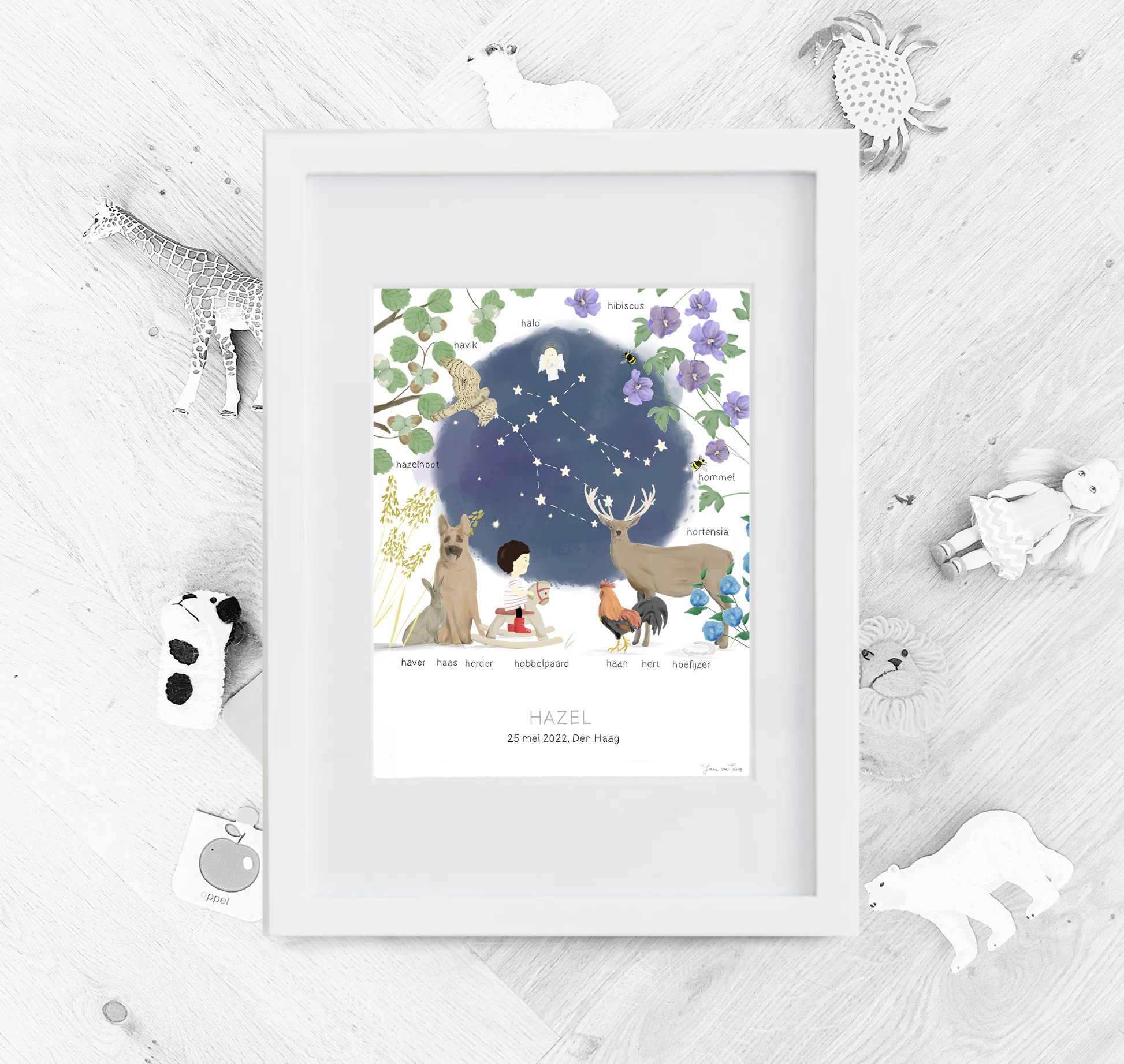 Uiteraard personaliseren we de geboorteprint met de naam of namen van jouw kindje, het sterrenbeeld dat past bij de geboortedatum en de geboorteplaats. Zo creëren we een unieke geboorteposter voor dit bijzondere moment.