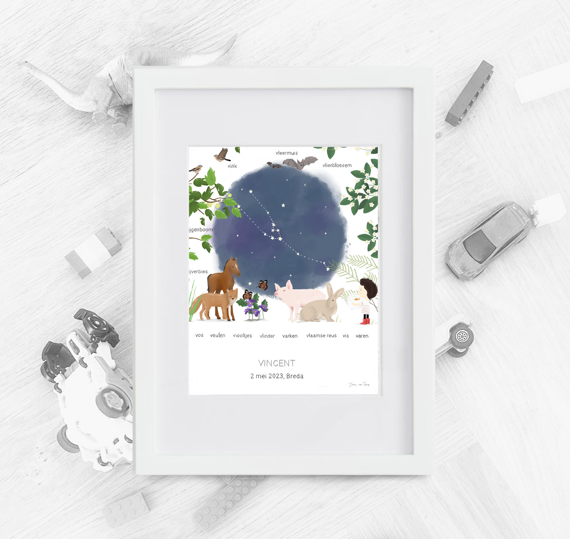 Uiteraard personaliseren we de geboorteprint met de naam of namen van jouw kindje, het sterrenbeeld dat past bij de geboortedatum en de geboorteplaats. Zo creëren we een unieke geboorteposter voor dit bijzondere moment.