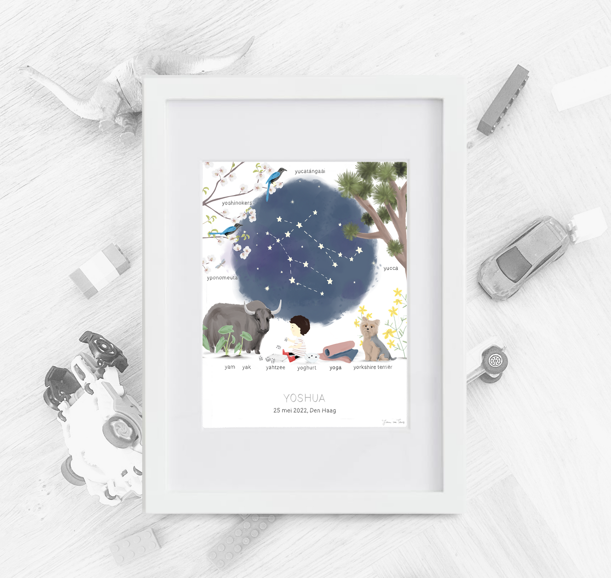 Uiteraard personaliseren we de geboorteprint met de naam of namen van jouw kindje, het sterrenbeeld dat past bij de geboortedatum en de geboorteplaats. Zo creëren we een unieke geboorteposter voor dit bijzondere moment.